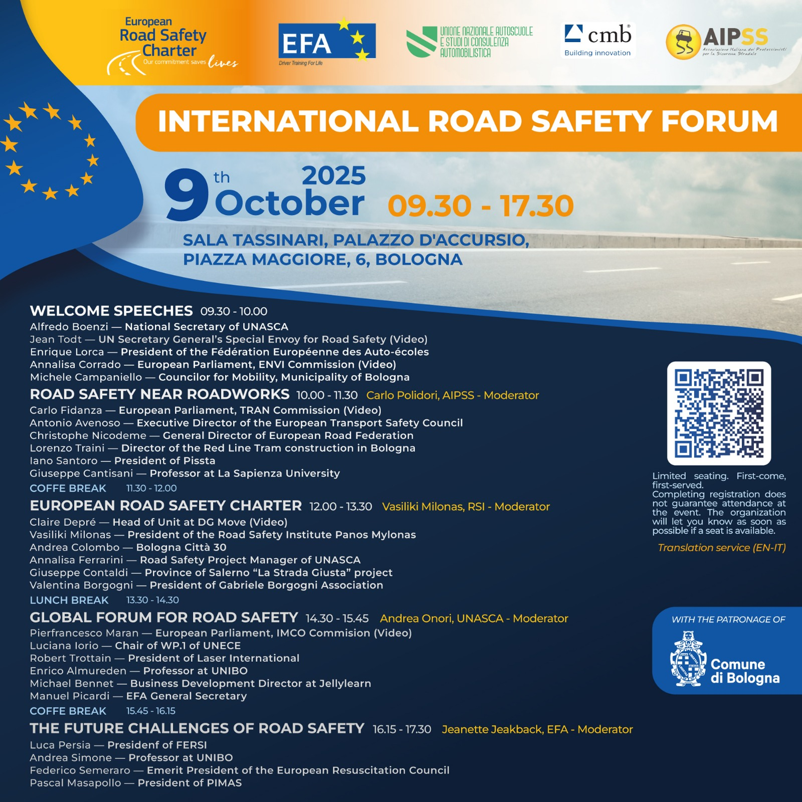 A strong link between road safety, emergency response, and life-saving training was at the core of the International Road Safety Forum, held on 9 October 2025 at Palazzo d’Accursio, Bologna. The event was organized by European Road Safety Charter, EFA – European Driving Schools Association, UNASCA, AIPSS, and partners, with the patronage of the Municipality of Bologna.